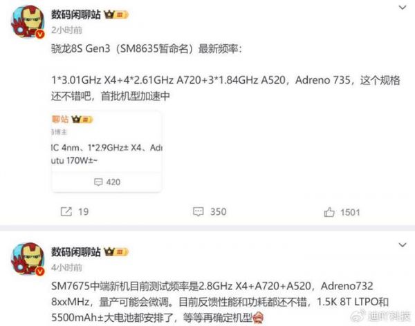 比如此前有消息称高通将于今年3月发布之前传闻中的SM7675及SM8635芯片,相当于同一款芯片的不同频率版本。