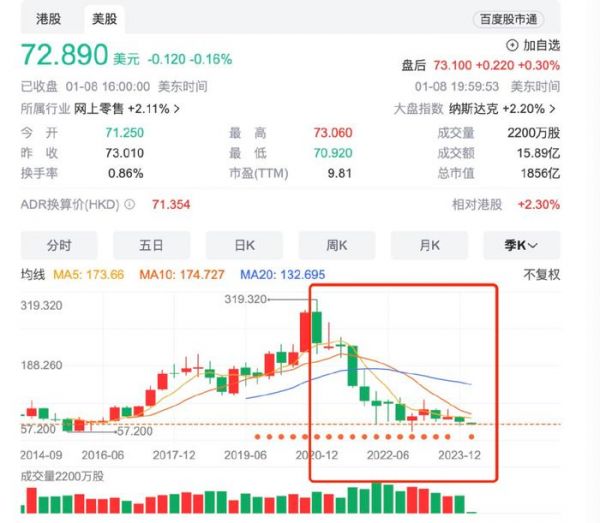 如今阿里巴巴的股价已跌至每股73美元以下,较2020年的300多美元下跌了75%。