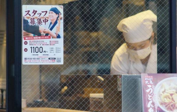 一家连锁餐馆门口张贴的招聘广告,时薪1100日元