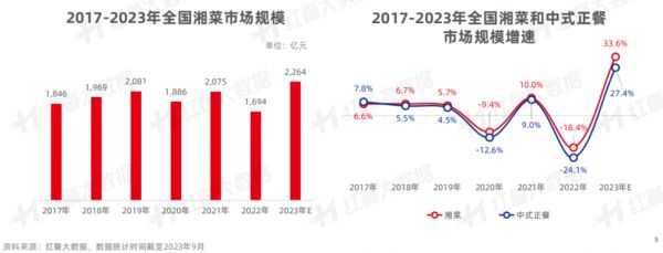 以“费大厨”为代表,湘菜品牌的韧性已清晰地显露出来。据红餐大数据,自2018年以来,湘菜市场规模的增速整体高于中式正餐。疫后复苏第一年,湘菜成为市场增速最快的菜系之一。据红餐大数据统计,截至2023年9月,全国湘菜门店数约11.8万家;近一年新增约2750家湘菜馆,而关闭的仅有约600家。