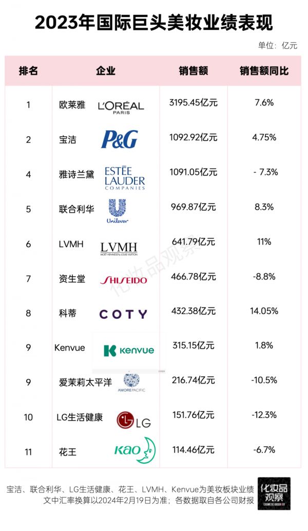 2023年,十一大国际巨头美妆业务总销售额达8700亿元人民币,较2022年同期增长4.6%。