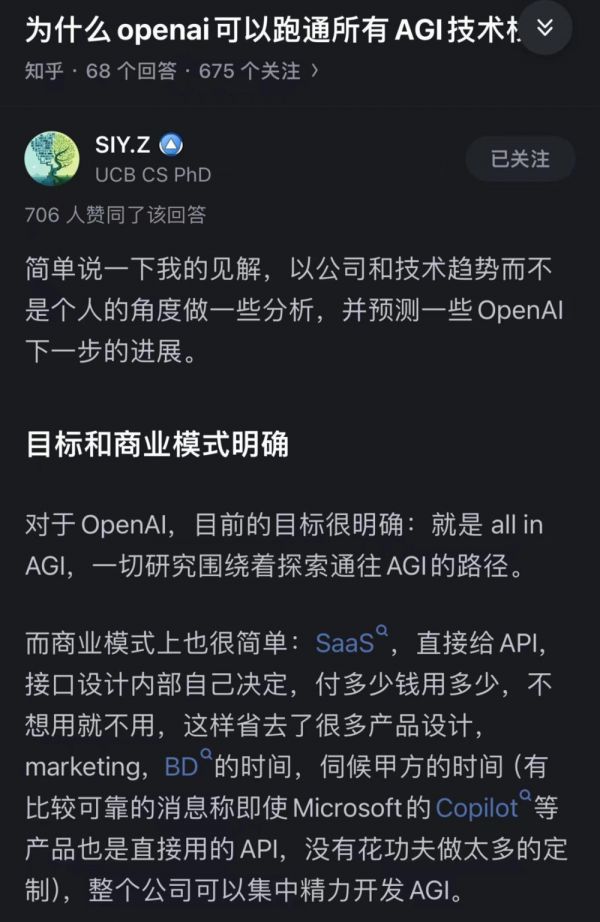 目标和商业模式明确:目标就是 all in AGI,一切研究围绕着探索通往 AGI 的路径;商业模式就是 SaaS,直接给 API。