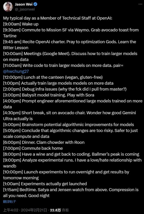 今天凌晨,OpenAI 研究人员 Jason Wei 自曝的每日工作时间线在社交网络上被疯传。