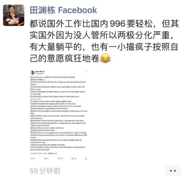 Meta FAIR 研究院研究员、高级经理田渊栋看完以后表示:都说国外没有 996,其实真正可怕的是自我驱动的卷。