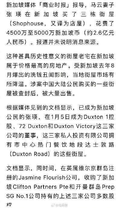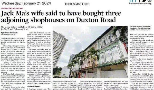 低调现身新西兰后,马云妻子张瑛又被曝花2.6亿元,一口气买三栋新加坡老宅。