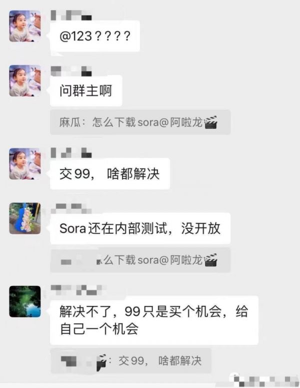 一张网络截图显示,有人凭借社群营销卖Sora课程获得收入200万元,而提供给学员的内容仅仅包含一份“Sora介绍”。有趣的是,当学员问群主如何解决无法下载Sora问题时,这位群主回复“解决不了,99元只是买个机会,给自己一个机会。”