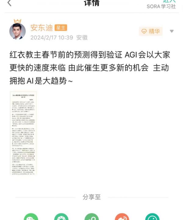 以知识星球星主安东迪的SORA学习社为例,99元申请费仅换来14条精华主题:第一条是知识星球的下载推荐;第二条是SORA的介绍资料和外网论文,点击链接直接跳转其他网络页面,甚至连中文翻译都没有;第三条为“关于Sora赚钱的十个方法”;第四至十四条精华主要介绍Sora的强大和影响,内容标题为“一个必须拥抱的大风口AI+视频”“AI会淘汰不会使用AI工具的人”等,也就是通过解读新技术制造焦虑。