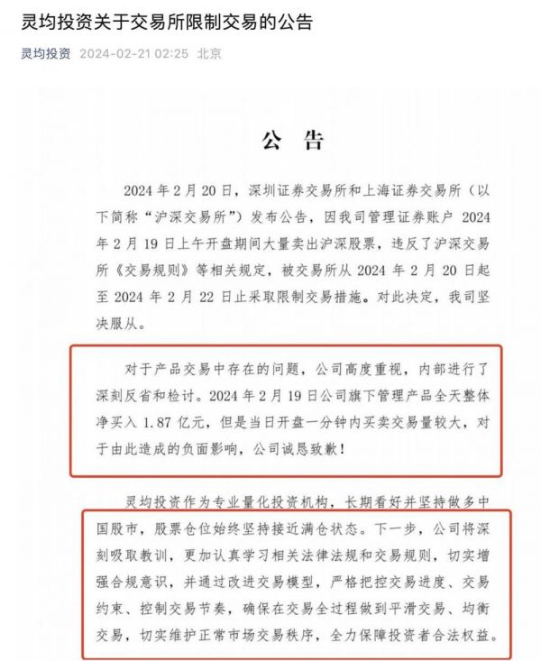 2月21日凌晨2点25分,灵均投资发布关于交易所限制交易的公告,表示“坚决服从”,深刻检讨,并向投资道歉。