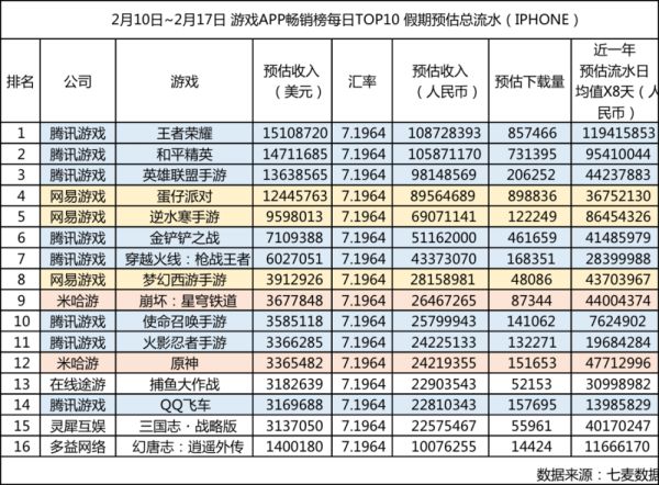 根据七麦数据预估,在8天假期(2月10日~2月17日)中,总计有六家游戏公司的16款游戏进入了 APP STORE的游戏畅销榜TOP10,总流水达人民币7.73亿,对比全年8天平均流水增长了8.63%。