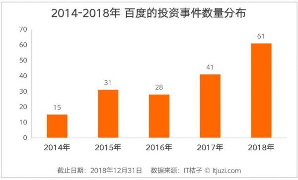 据IT桔子,百度2018年投资事件数量达到61起,但跟阿里巴巴、腾讯相比仍有很大差距,百度尚不及AT的一半(阿里129起,腾讯163起)。