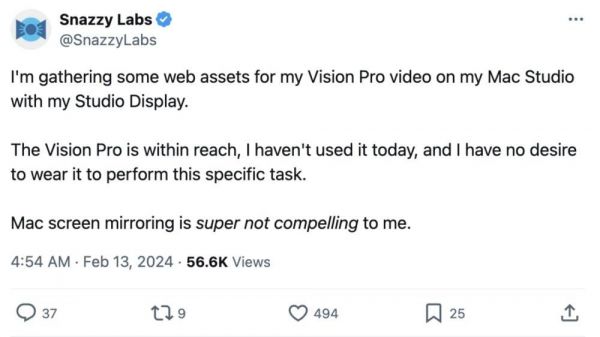 首先是价格,3999美元的价格,哪怕是苹果应用开发者们也觉得过高。Halide iPhone相机应用程序的开发者塞巴斯蒂安·德维兹(Sebastian de With)也在社交平台上宣布自己将退货苹果Vision Pro。他说:“尽管这是一项很酷的技术,但对于一家独立商店来说这也是很多钱!”曾担任特斯拉供应链的经理法扎德·梅斯巴希(Farzad Mesbahi)也认为,尽管苹果“做出了一款不会头晕的头显,但他觉得不值这个价。”