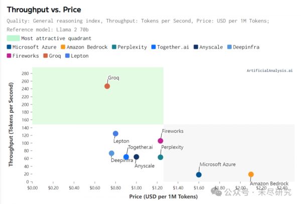 这是Groq使用的一张第三方机构的分析。从中可以看出,Groq每百万token的价格最低,在0.7美元左右,而且其吞吐速度看起来“遥遥领先”。其中排第二位的,是华人AI科学家贾扬清创办的Lepton。