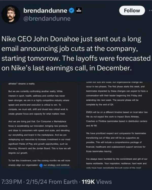 据报道,美国时间2月15日晚,耐克公司(Nike)首席执行官John Donahoe在一封向全公司发出的电子邮件中告诉员工,公司将裁员2%,预计此次裁员不会影响商店员工、配送中心员工以及其创新团队的员工。