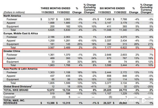 按地区来看,大中华区营收同比增长4%至18.63亿美元,在汇率不变基础上同比增长8%。大中华区也是耐克业绩增长速度第二快的地区。细看大中华区里耐克的各项业务,鞋类营收同比减少1%至13.61亿美元,服饰同比增长19%至4.69亿美元,设备同比增长32%至0.33亿美元。
