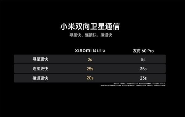 视频具体来看,在寻星速度方面,小米14 Ultra用时2秒完成寻星,而友商60 Pro用时5秒,在连接速度上,小米14 Ultra用时25秒,友商60 Pro用时35秒。