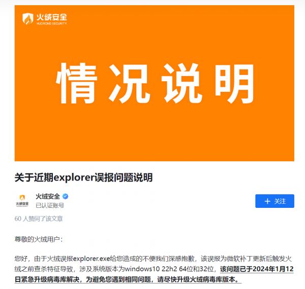 不过火绒这边的动作也非常快,很快就发了公告,更新完特征库了。