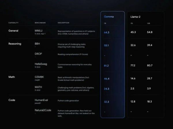 Gemma在基准测试上与Llama 2的跑分对比(图源:谷歌)