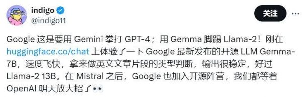 X用户@indigo11分享Gemma试用体验(图源:X)