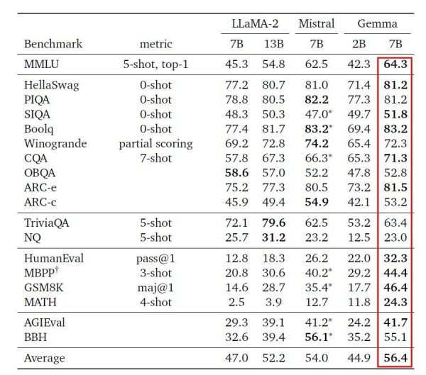 从具体能力上看,Gemma 7B在问答、推理、数学/科学、代码等方面的标准学术基准测试平均分数都高于同规模的Llama 2和Mistral模型。