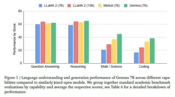 Gemma与Llama 2、Mistral各能力对比(图源:谷歌)
