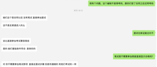 该工作人员表示,如果通过该渠道入职有编制的工作,不需要参加笔试,可以直接进入面试流程。而在面试过程中,只要求职人员的基础条件符合,就可以保证顺利通过。