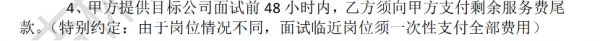 但仔细看,合同细则是经不起推敲的。例如,乙方必须在支付相应的服务费后,才能享受甲方提供的岗位信息服务,甲方提供目标公司面试前48小时内,乙方须向甲方支付剩余服务费尾款。