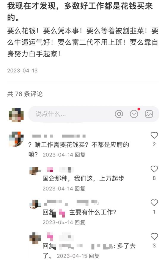 在小红书等社交平台上,有关花钱买工作靠不靠谱、花钱买工作渠道推荐等帖子并不少见,有人直言,在不少地方,各行各业的多数好工作都是花钱买来的,不花钱已经上不了班了。
