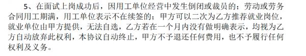 此外,合同还显示,在面试上岗成功后,如果用工单位经营中发生倒闭或裁员的;劳动或劳务合同用工期满,用工单位表示不再续签的;甲方可以二次为乙方推荐就业岗位,就业单位由甲方提供,无法自选,乙方若在一个月内没有做明确表示,均视为乙方自动放弃此权利,本协议自动终止,甲方不予退还任何费用,也不予履行任何权利及义务。