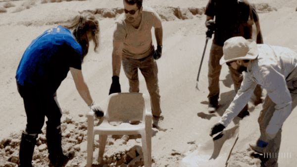 提示词为“考古学家在沙漠中发现了一把普通的塑料椅子,正小心翼翼地挖掘和除尘”,Sora生成的视频出现了椅子变形、自动行走等诡异的场景。