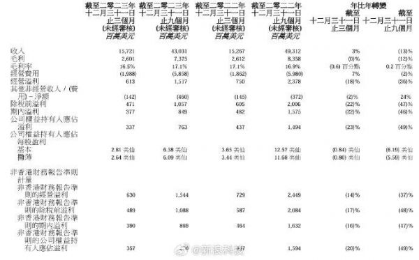 【联想集团发布第三财季财报:#联想集团中国区收入下降10%#】联想集团今日发布 2023 / 2024 财年第三财季(2023 年 10-12 月)业绩公告,第三财季营收 157.2 亿美元(当前约 1130.27 亿元人民币),预估 153.6 亿美元,上年同期 152.67 亿美元,同比增长 3%。第三财季净利润 3.370 亿美元(当前约 24.23 亿元人民币),预估 3.05 亿美元,同比下滑 23%。