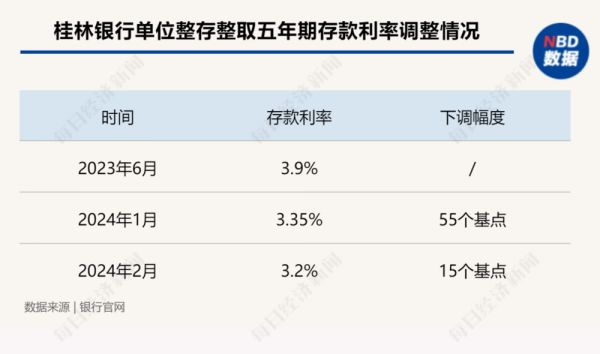 记者注意到,广西另一家银行——桂林银行已多次调整单位整存整取五年期存款利率,该存款产品利率累计下调了70个基点。去年6月,该行发布公告称,调整此项存款利率至3.9%;今年1月该行再发文称,调整此项存款利率至3.35%;2月20日,桂林银行发布公告称,调整单位整存整取五年期存款产品执行利率至3.2%。