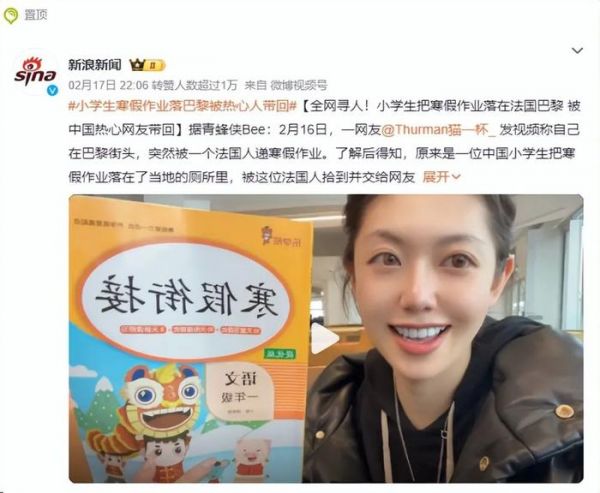 在微博平台上,“小学生寒假作业落巴黎被热心人带回”的话题更是由新浪新闻官方账号发布并助推,并在热搜榜上持续发酵。