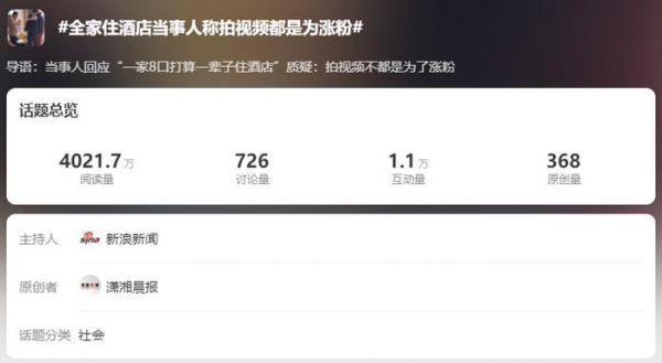 让人哭笑不得的是,在谣言的真相被揭开之后,微博又通过官方账号发布相关内容,将#一家8口长住酒店被质疑炒作#和#全家住酒店当事人称拍视频都是为涨粉#两个话题送上热搜。可以说是从事中到事后,一点没把这事的热度浪费。