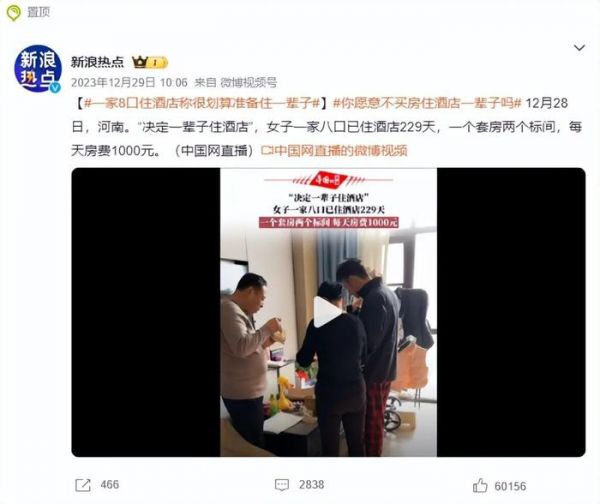 此事经由@新浪热点官方账号发布后,便迅速在全社会引发关注,#一家8口住酒店称很划算准备住一辈子#的话题也登上了微博热搜第一名,并引发了众多官方媒体账号的转载和报道。
