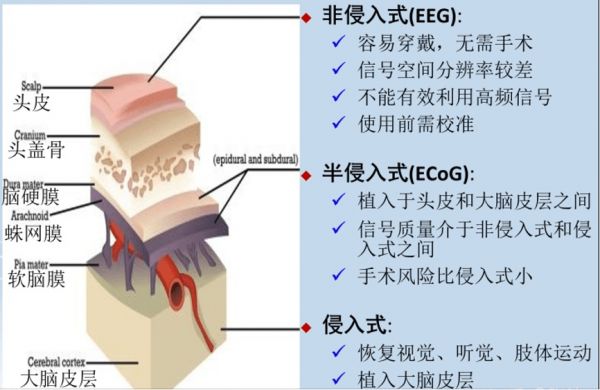 硅谷101:脑机接口目前包括非侵入式、侵入式、半侵入式等几种不同模式。非侵入很好理解,就是没有任何伤口,而是通过在脑部贴32~64个传感器。侵入式也很好理解,就比如Neuralink这种挖掉一小块头骨再埋入芯片。那么,半侵入式是什么呢?