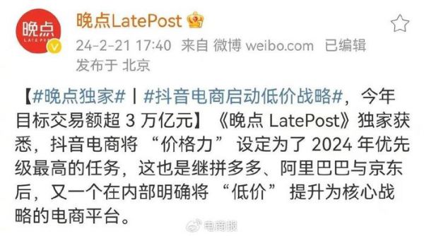 据晚点LatePost独家报道,抖音电商将“价格力”设定为了2024年优先级最高的任务。低价被抖音电商提升为核心战略。