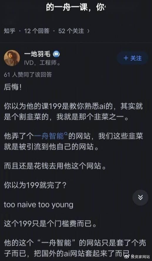 另一边,买过李一舟AI课的人,开始质疑李一舟,大喊,“被割韭菜了。”一位网友去知乎发帖称,“买了李一舟的一舟一课,你们后悔了么?”网友回复,“后悔!你以为他的课199是教你熟悉AI的,其实就是个割韭菜的,我就是那个韭菜之一。”此外,该网友指出了李一舟课程玩法套路:“他弄了个一舟智能的网站,我们这些韭菜就是被引流到他的网站。而且还是花钱去用他这个网站。他这个网站只是套了个壳,把国外AI网站套起来。”