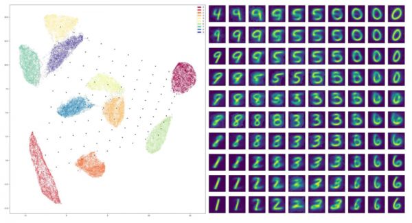 如图3所示,我们用MNIST训练了一个编码解码器,在隐空间画出了数据集的隐空间分布,10个手写体数字对应着10个团簇,每个团簇是一个模式(mode),即数据流形的一个联通分支。团簇的边界就是数据隐空间分布支集的边界。我们在隐空间生成了100个采样点,通过解码生成100个手写体数字图像。如果采样点落在某个团簇内部,则其生成的图像就非常清晰;如果采样点落在团簇边界的外部,则其生成的图像就非常模糊,往往是两个手写体数字的融合。因此,识别数据流形的边界对于识别临界状态非常重要。
