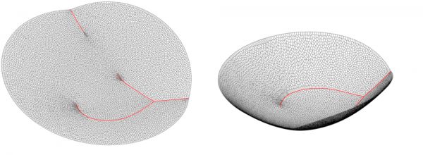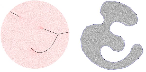 这一势能函数满足蒙日-安培方程,势能函数并非处处可导,其连续、非可导的集合投影到圆盘区域的奇异集合(黑色曲线),规则点映射到目标区域的规则点,奇异集合映射到目标区域的边界(每个奇异点同时映射到左右两个边界点)。