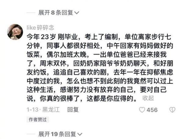 我的同事夏虫就有一个朋友,出身于四五线小城市公务员家庭,大一开始在其他同学还在忙着搞社团活动的时候她就在刷考公题目了,毕业时如愿考到了家乡的编制,过上了有钱有闲的安稳日子,她说“只有公务员家庭的孩子才懂这有多香”。