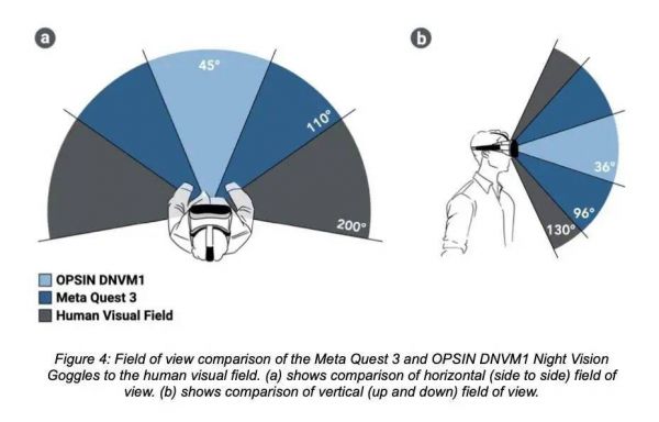 以视角广度来说,我们肉眼一般横向可看到 200° 的内容,但 Meta Quest 3 呈现的广度只有 110°。