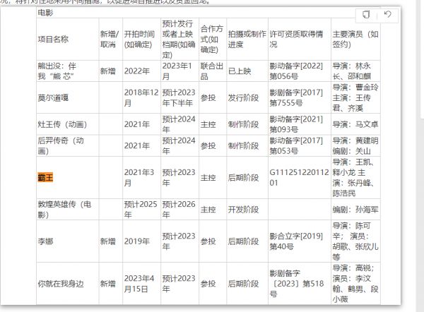 此外,文投控股主控的电影《霸王》,原计划2023年上映,目前也未见更新消息。