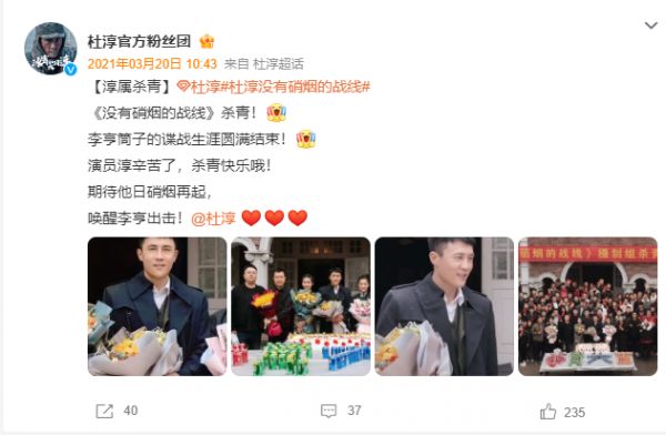 公开资料显示,《没有硝烟的战线》改编自著名作家马识途同名小说,是一部由杜淳、颖儿等主演的谍战剧。2021年3月,杜淳的粉丝团曾在微博上晒出该剧摄制组杀青的照片。