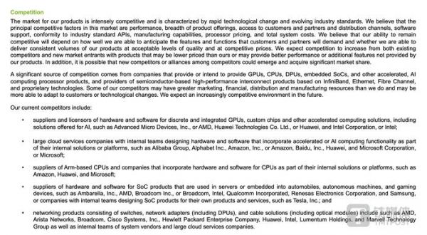 在文件中,英伟达称,包括分立和集成 GPU、定制芯片和其他 AI 加速计算解决方案、AI 算力或平台级大型云服务公司、交换机、网络适配器(包括 DPU)等多个领域中,华为都是英伟达的重要竞争对手之一。