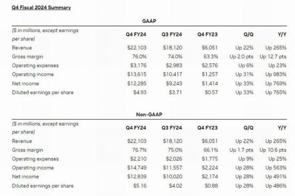 财报显示,在2024财年第四季度,英伟达营收为221.03亿美元,同比增长265%;净利润为122.85亿美元,同比增长769%。