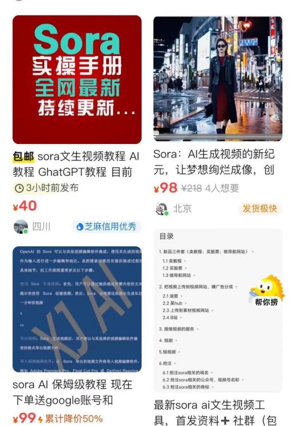 在某二手交易网站,不少商家也挂出了相关教程。在一位号称“Sora AI 保姆级教程”、售价99元的商品简介中,商家称,该教程包含Sora AI 提示词大全,包括场景和环境提示词,角色动画提示词,历史事件提示词,品牌标识提示词,销售技巧提示词,财务规划提示词,小型企业营销提示词等等。
