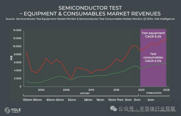 2023年,半导体行业在测试设备和耗材上的支出为134亿美元,占行业收入的2.5%,并且还在不断增长。Yole Group预计,2023年至2028年,测试设备市场将以6.2%的复合年增长率(CAGR)扩张,其中测试耗材年增长率为6%。