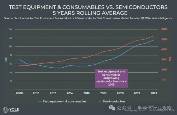 “直到 2013 年,半导体测试的成本一直呈下降趋势,但自 2019 年以来,测试设备和耗材收入的增长一直超过半导体收入。”Yole Group 制造和全球供应链活动业务线副总监John West说。