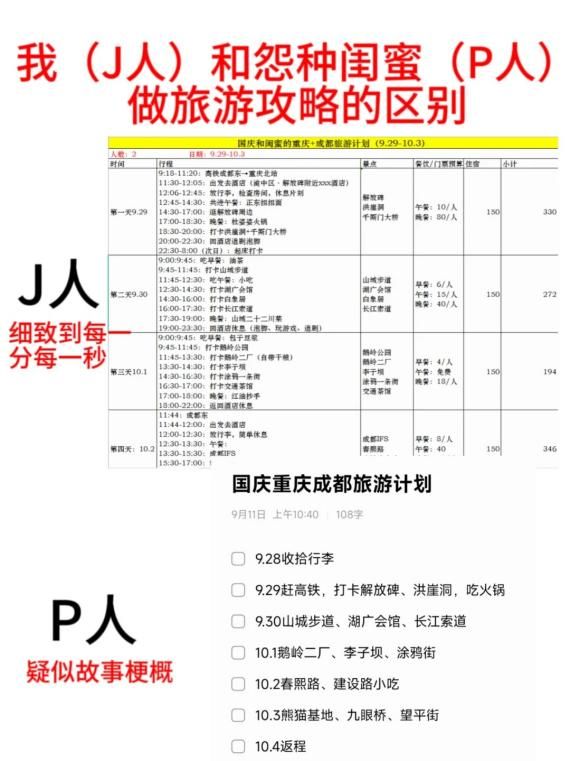网友们化身当代“神农”,以科研般的精神收集J人与P人各类日常行为的对比图谱大全:J人的房间井井有条,P人的房间主打战乱风格;当P人列好出游目的地概览时,J人已经将精确到分钟的旅行计划发送到微信群里等待同伴确认;P人电脑桌面里永远有一个命名为“杂七杂八”、能够装下整个宇宙的文件夹,而J人则按时间排序,将文件整理得一丝不苟,给你一点小小的J人震撼。