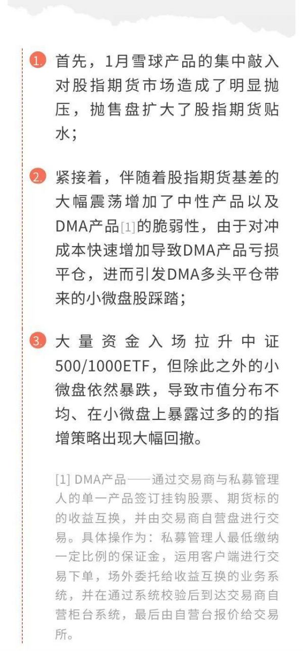 从以上信息可见,量化产品自1月中起,就一直面对资金面的不利影响,而且是逐渐加速的。量化策略本身有吸收资金面波动、稳定市场截面的作用,因此在前两周(1月15日~26日)的超额影响有限。但当市场风格一直走极致的单边行情时,量化的吸收能力被耗尽,随后市场的流动性迅速消失,量化超额也开始出现加速亏损。